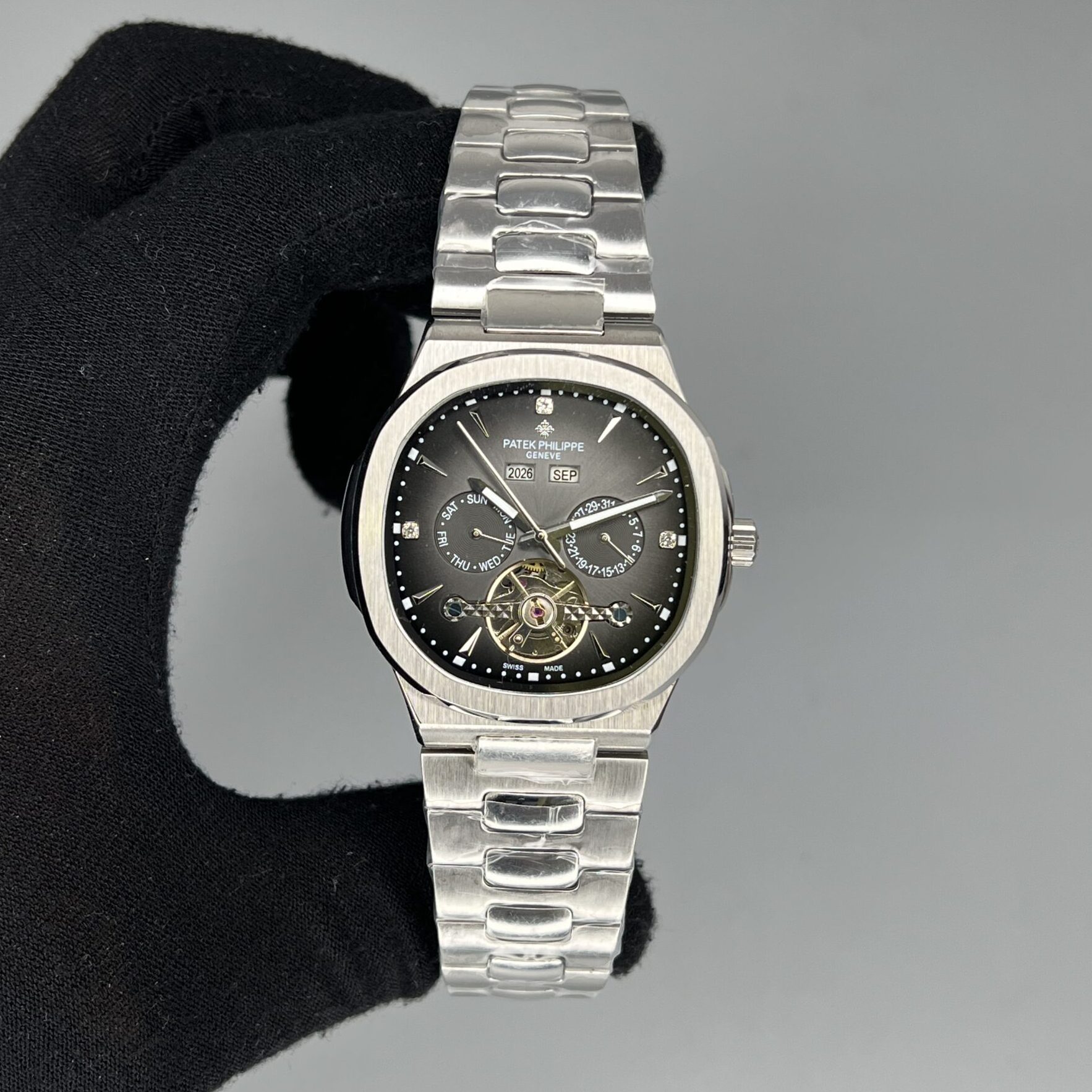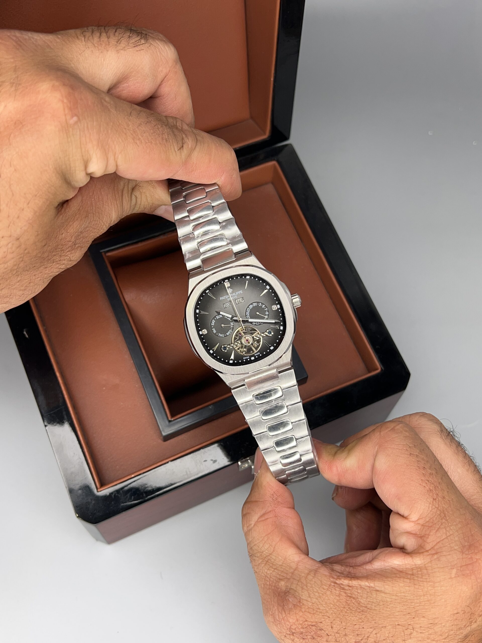 یکی از ویژگیهای برجسته ساعت پتک فیلیپ ناتیلوس Patek Philippe Nautilus 5088، صفحه طوسی رنگ آن است که ترکیبی از سادگی و لوکس بودن را ارائه میدهد. این صفحه با طراحی حرفهای و دقیق، قابلیت خوانایی بالا را فراهم میکند و با عقربهها و اندکسهای شبنما دار، امکان مشاهده زمان حتی در نور کم را فراهم میآورد. طراحی صفحه این ساعت بهگونهای است که همزمان میتوان تقویم سال، ماه و هفته را مشاهده کرد، ویژگیای که این مدل را نسبت به سایر ساعتها متمایز میکند.