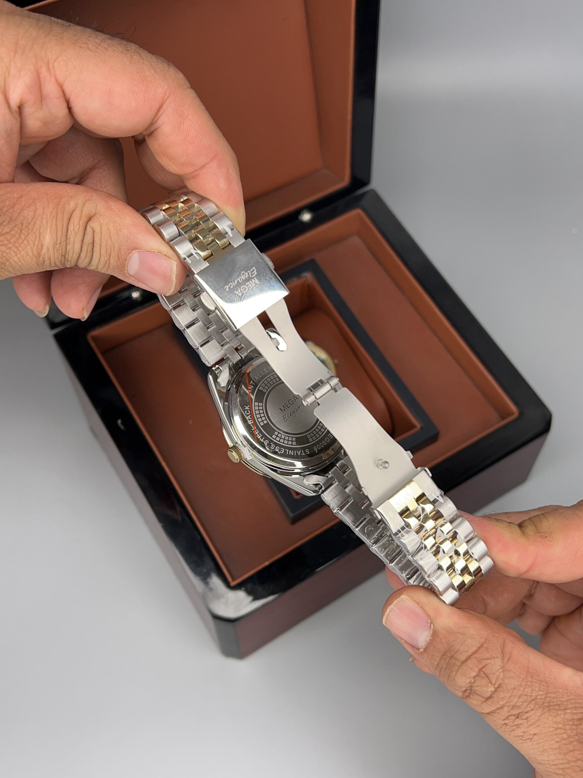 بند ساعت ست کلاسیک الگانس دو رنگ طلایی صفحه سبز Elegance 2634 نیز از استیل ۳۱۶ ساخته شده است. طراحی بند بهگونهای است که نه تنها با قاب ساعت هماهنگ است، بلکه راحتی استفاده را برای شما فراهم میکند. این بند به شکلی طراحی شده که بهخوبی روی مچ دست مینشیند و هیچگونه فشار یا ناراحتی ایجاد نمیکند. مفصلبندی دقیق بند باعث میشود که ساعت در دست شما بهطور راحت و ایمن قرار گیرد.
