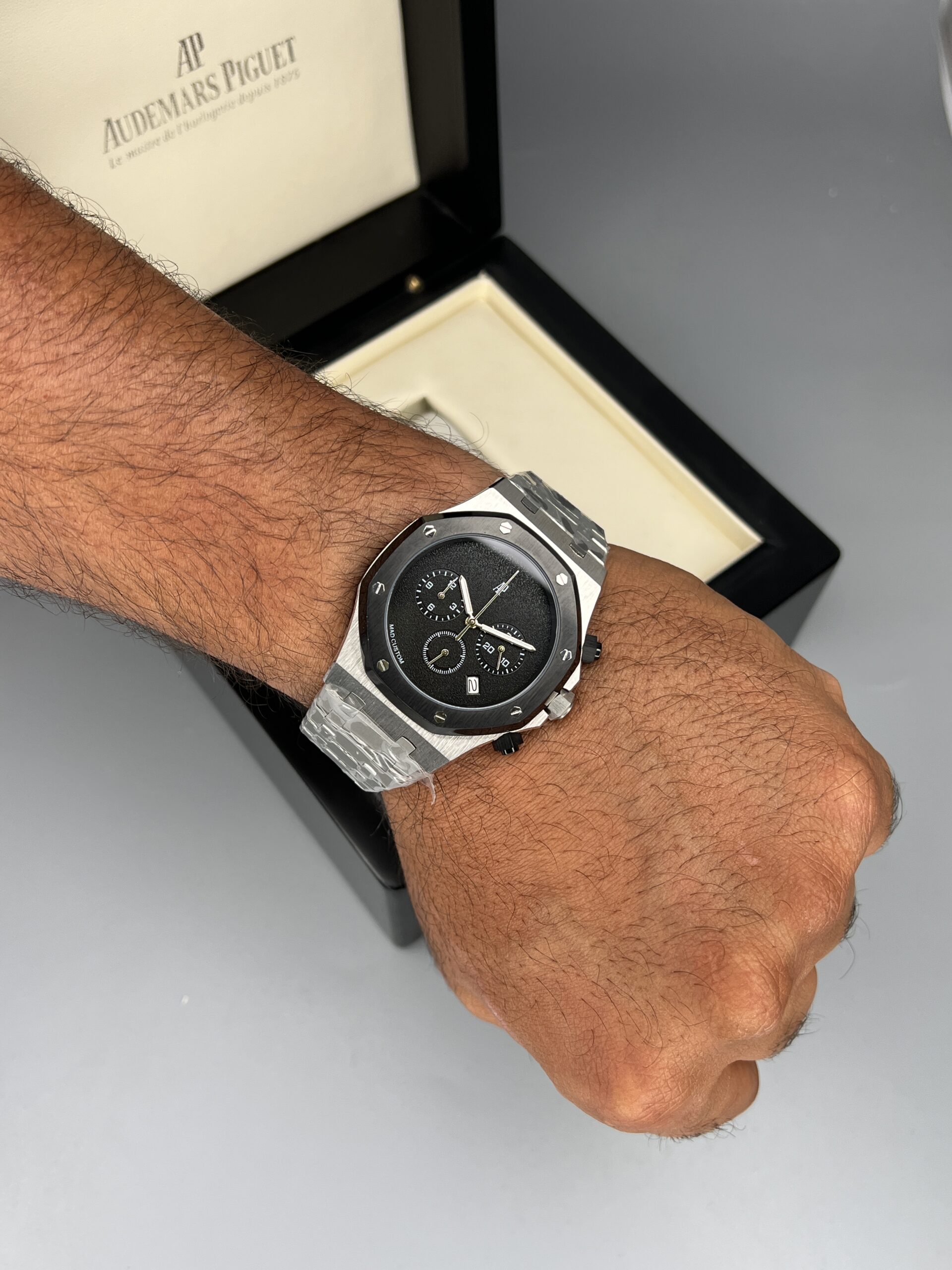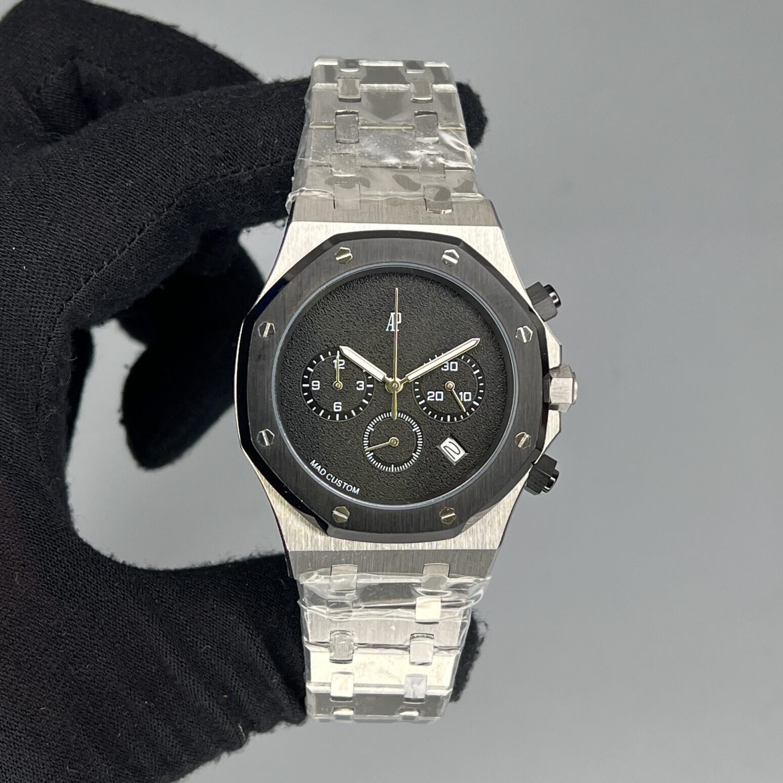 صفحه‌ی مهندسی مشکی، جزئیات سه‌بعدی و چینش مهندسی‌شده دارد. ساب‌دایال‌های کرنوگراف در دل این صفحه جای گرفته‌اند و نظم بصری خاصی ایجاد می‌کنند. طراحی صفحه مهندسی، هویت AP را در همان نگاه اول آشکار می‌کند.