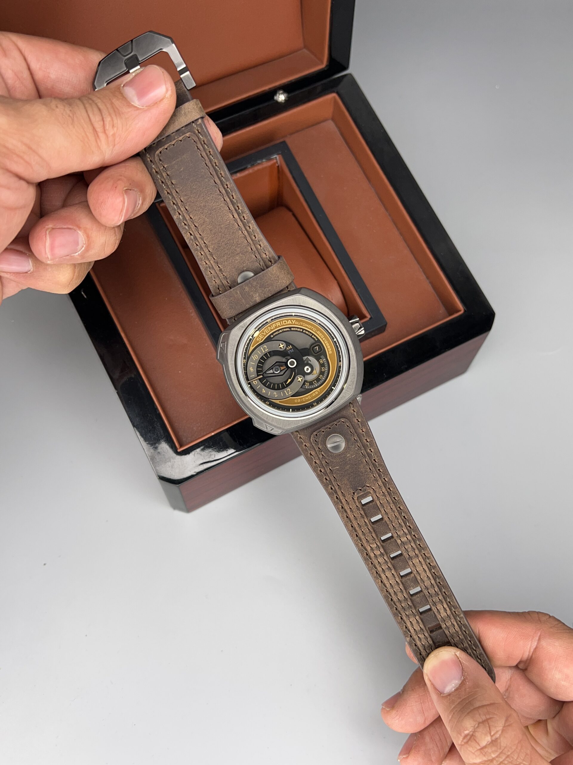 بند چرم طبیعی قهوه‌ای، با رنگ گرم و سنگین خود، نه تنها راحتی لازم برای استفاده روزانه از یک ساعت بزرگ را فراهم می‌کند، بلکه یک حس وینتیج و در عین حال مستحکم به ساعت می‌بخشد. چرم طبیعی با دوخت صنعتی مستحکم، با گذشت زمان، یک پتینه (Patina) یا ظاهر منحصر به فرد پیدا می‌کند که به شخصیت سون فرایدی ۱۹۹۴ می‌افزاید و داستان‌های زیادی برای گفتن خواهد داشت. رنگ قهوه‌ای بند، با صفحه مشکی تضاد چشم‌نوازی ایجاد می‌کند و یک ظاهر یکپارچه، مجلل و خاص را برای این مدل ایجاد می‌کند.