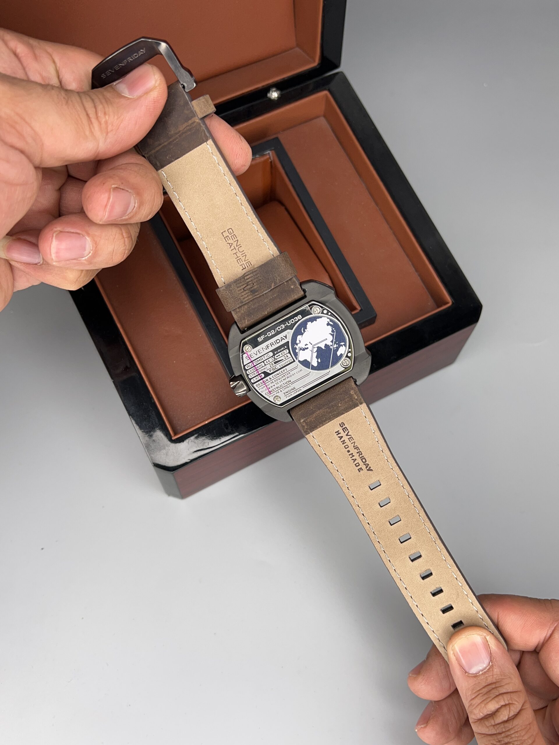 بند چرمی قهوه‌ای باکیفیت در مدل‌های Sevenfriday، مکمل طراحی صنعتی و خاص قاب است. در ساعت مچی مردانه سون فرایدی ۱۹۹۴ Sevenfriday، بند چرم طبیعی قهوه‌ای به کار رفته که به خوبی با طراحی پرقدرت و رنگ غالب قاب هماهنگ می‌شود.