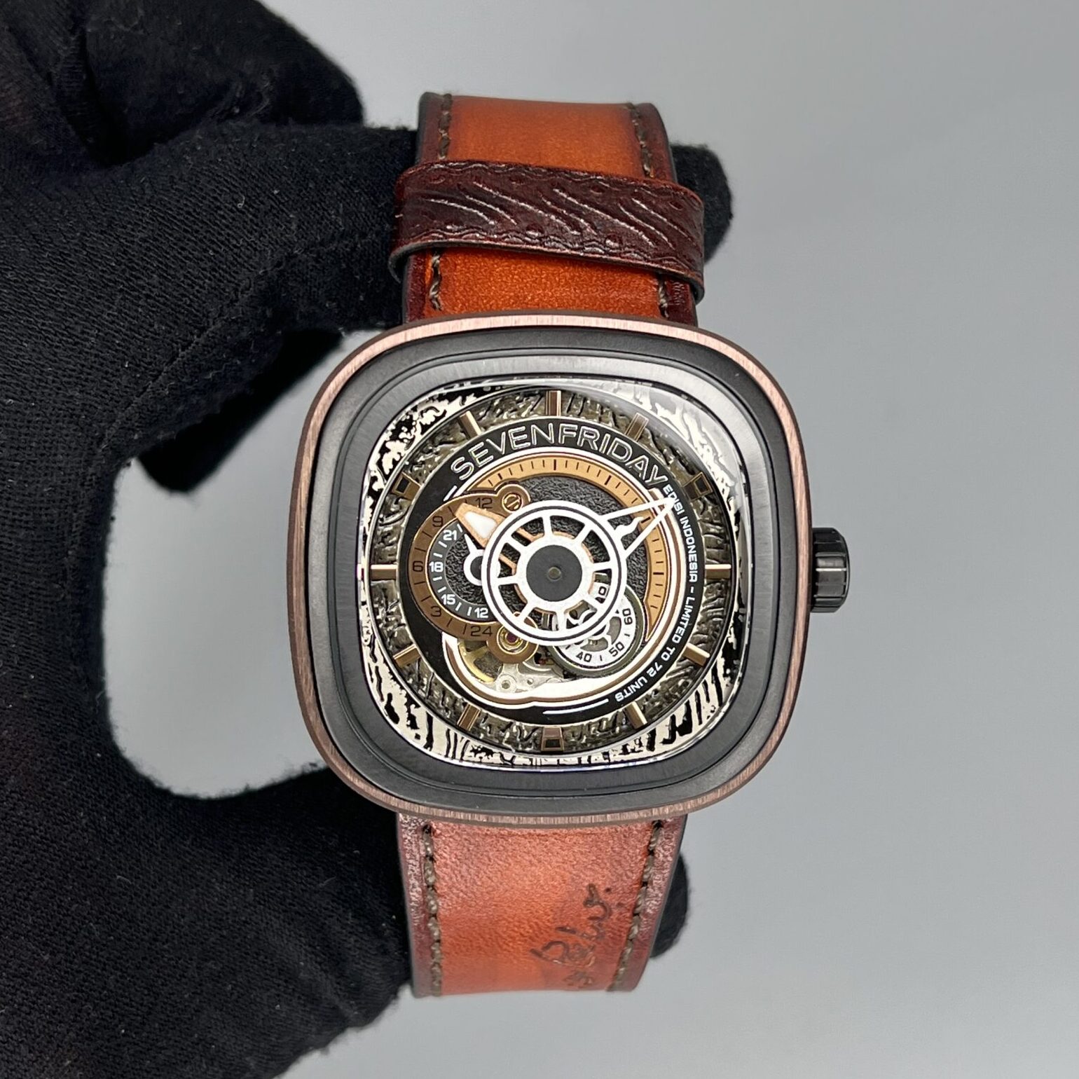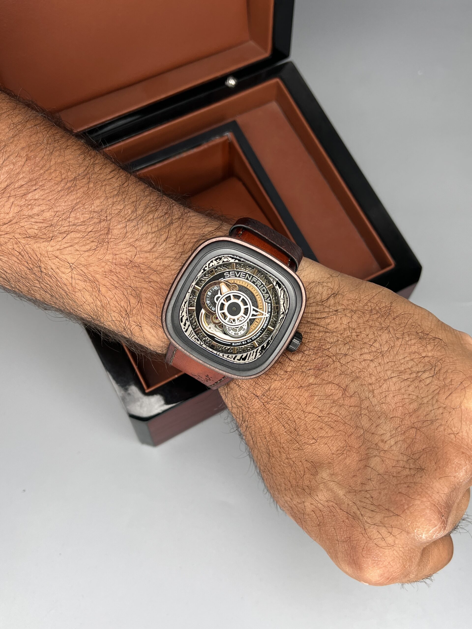 ساعت مچی مردانه سون فرایدی ۱۹۹۵ Sevenfriday با قاب بزرگ و مربعی‌شکل خود (حدود ۴۷ میلی‌متر)، یکی از امضاهای اصلی برند سون فرایدی را به نمایش می‌گذارد. قاب مربعی از جنس استیل ضد زنگ، در این مدل با یک روکش با کیفیت (احتمالاً PVD) با تِم قهوه‌ای یا برنزی عرضه می‌شود تا هماهنگی کاملی با بند چرمی قهوه‌ای و صفحه طوسی داشته باشد. این طراحی، حس یکپارچگی مهندسی و ساختاری مستحکم را منتقل می‌کند و بر تمایز این ساعت در مقابل ساعت‌های کلاسیک دیگر تأکید می‌ورزد.