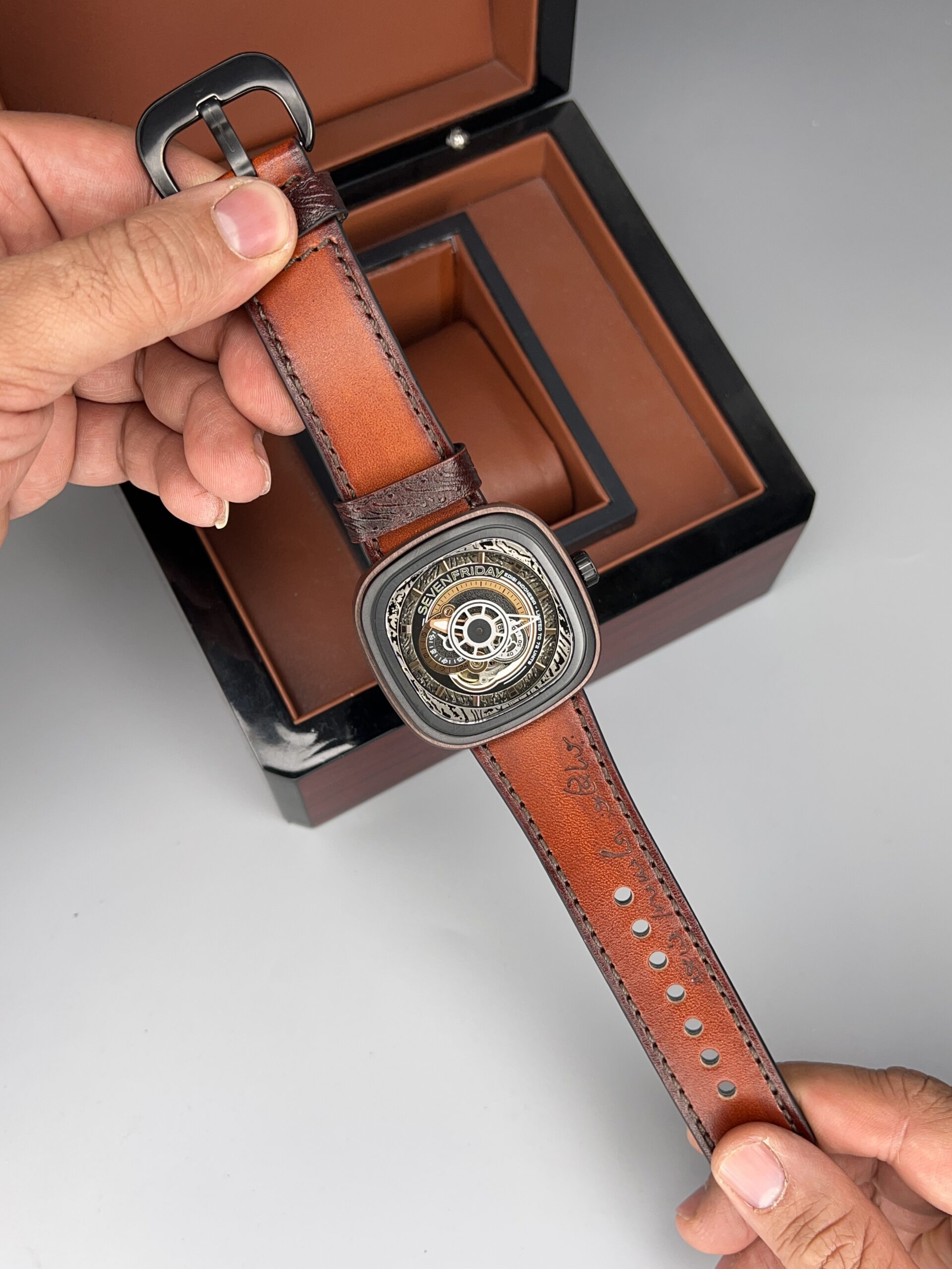 بند چرمی قهوه‌ای باکیفیت در مدل‌های Sevenfriday، مکمل طراحی صنعتی و خاص قاب است. در ساعت مچی مردانه سون فرایدی ۱۹۹۵ Sevenfriday، بند چرم طبیعی قهوه‌ای به کار رفته که به خوبی با طراحی پرقدرت و تم قهوه‌ای قاب هماهنگ می‌شود.