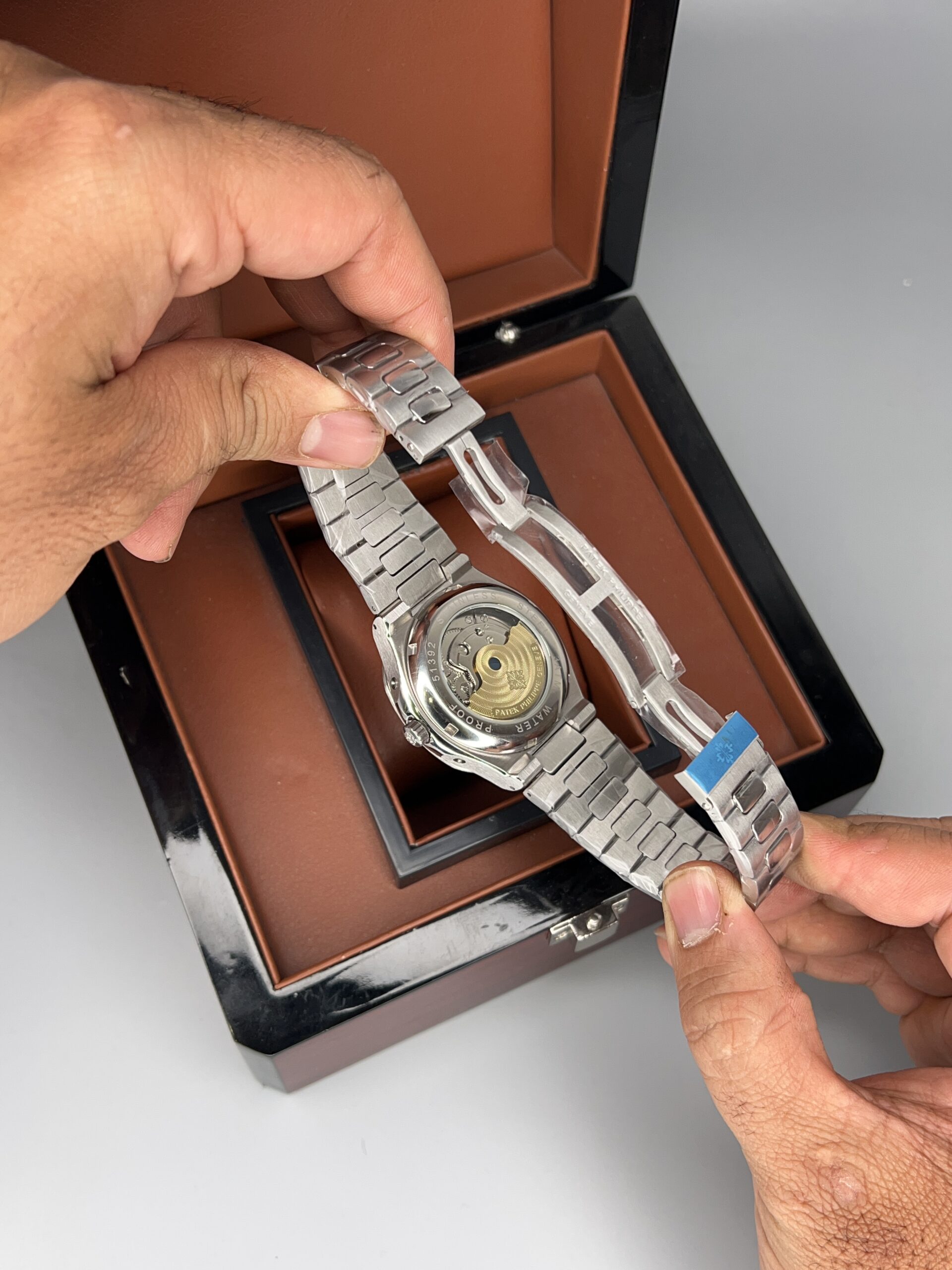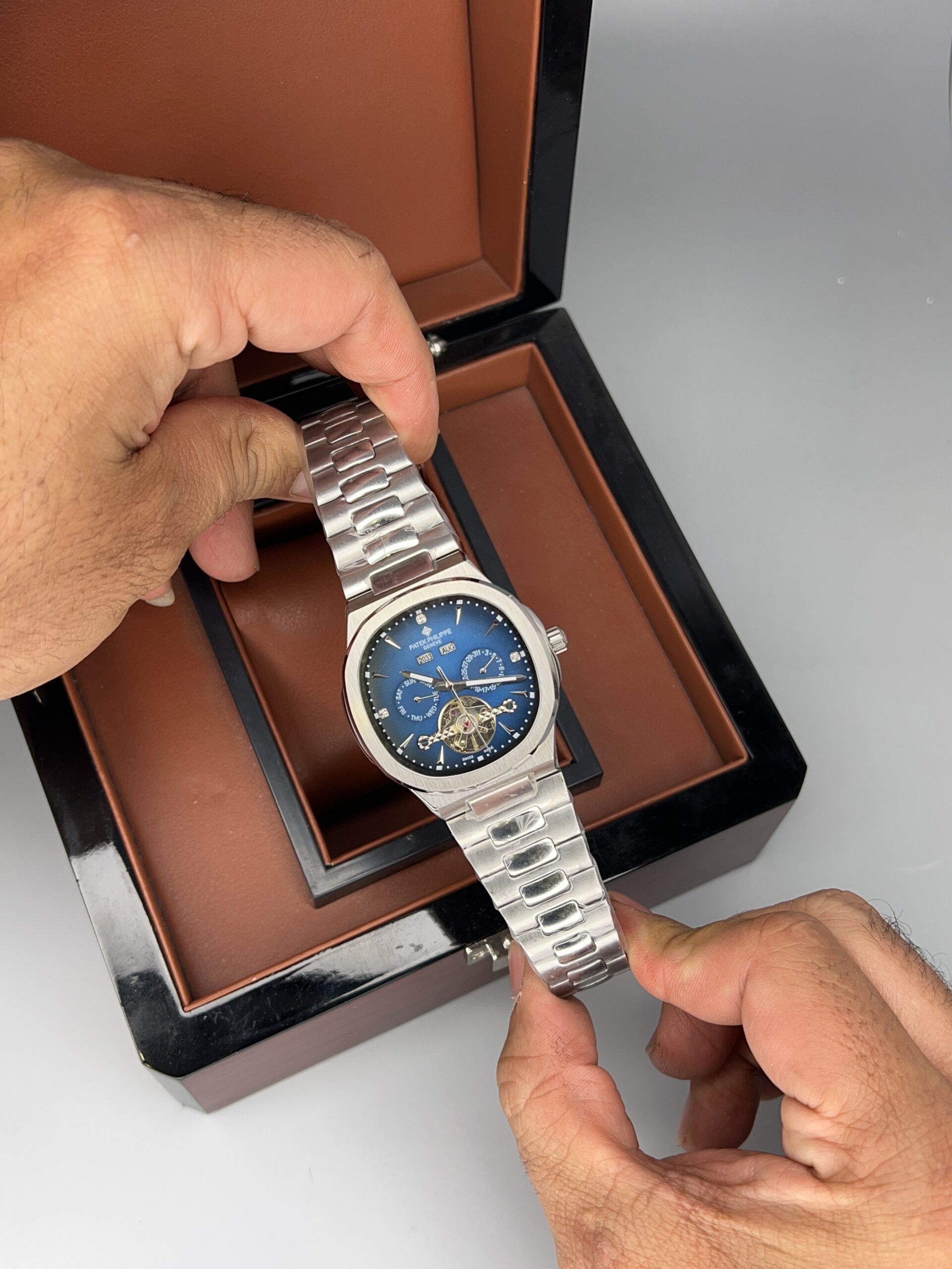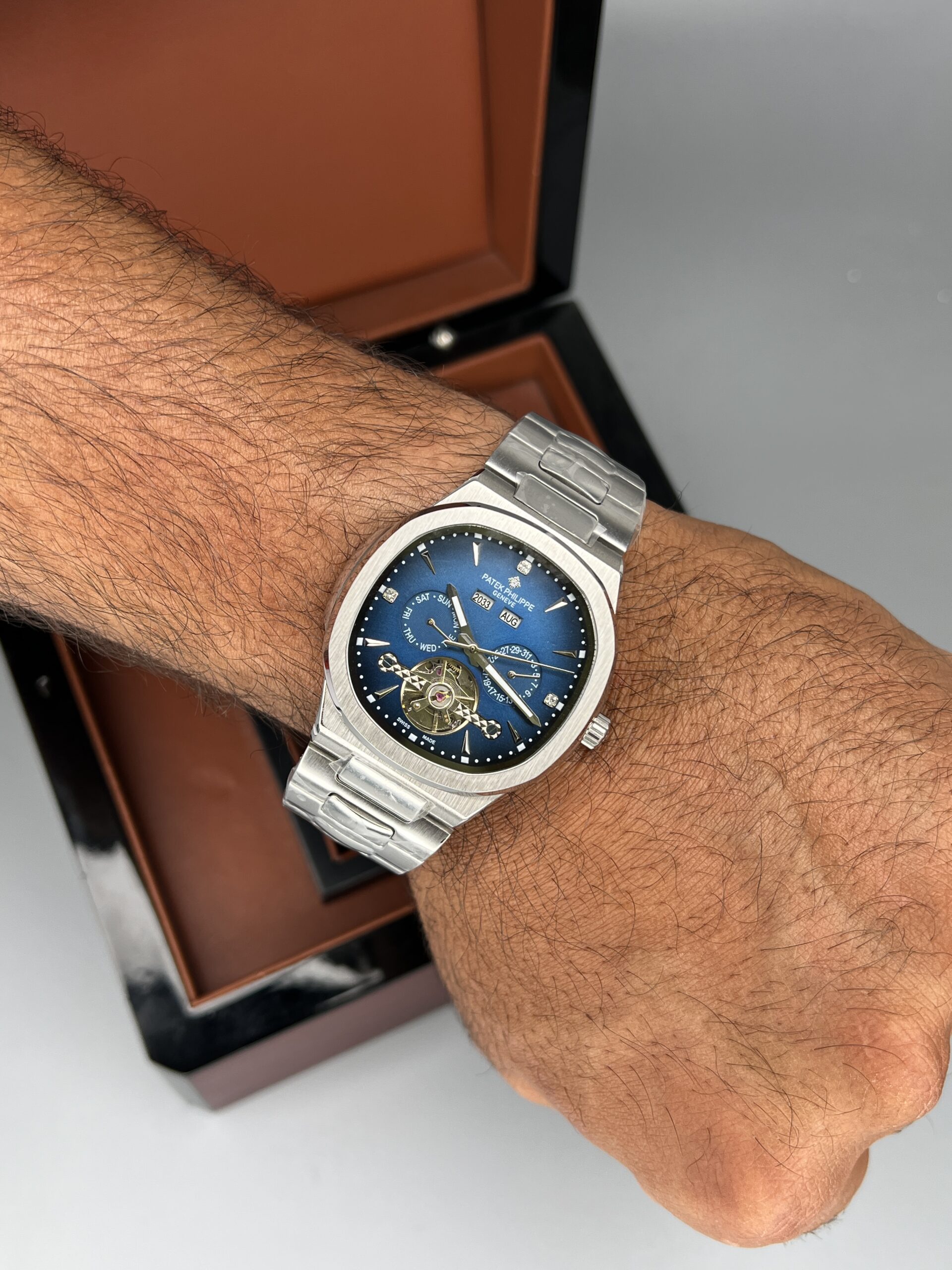 جدیدترین مدل پتک فیلیپ ناتیلوس با طراحی زیبا، امکان نمایش همزمان تقویم سال، ماه و هفته را فراهم میکند و تمامی موتورهای آن فعال هستند. این ساعت با موتور سویس اتوماتیک، سه موتوره فعال، توربینول دار و صفحه سرمهای، ترکیبی کامل از زیبایی، دوام و عملکرد دقیق را ارائه میدهد و انتخابی ایدهآل برای استفاده روزمره، موقعیتهای رسمی و حتی کلکسیونهای لوکس محسوب میشود.