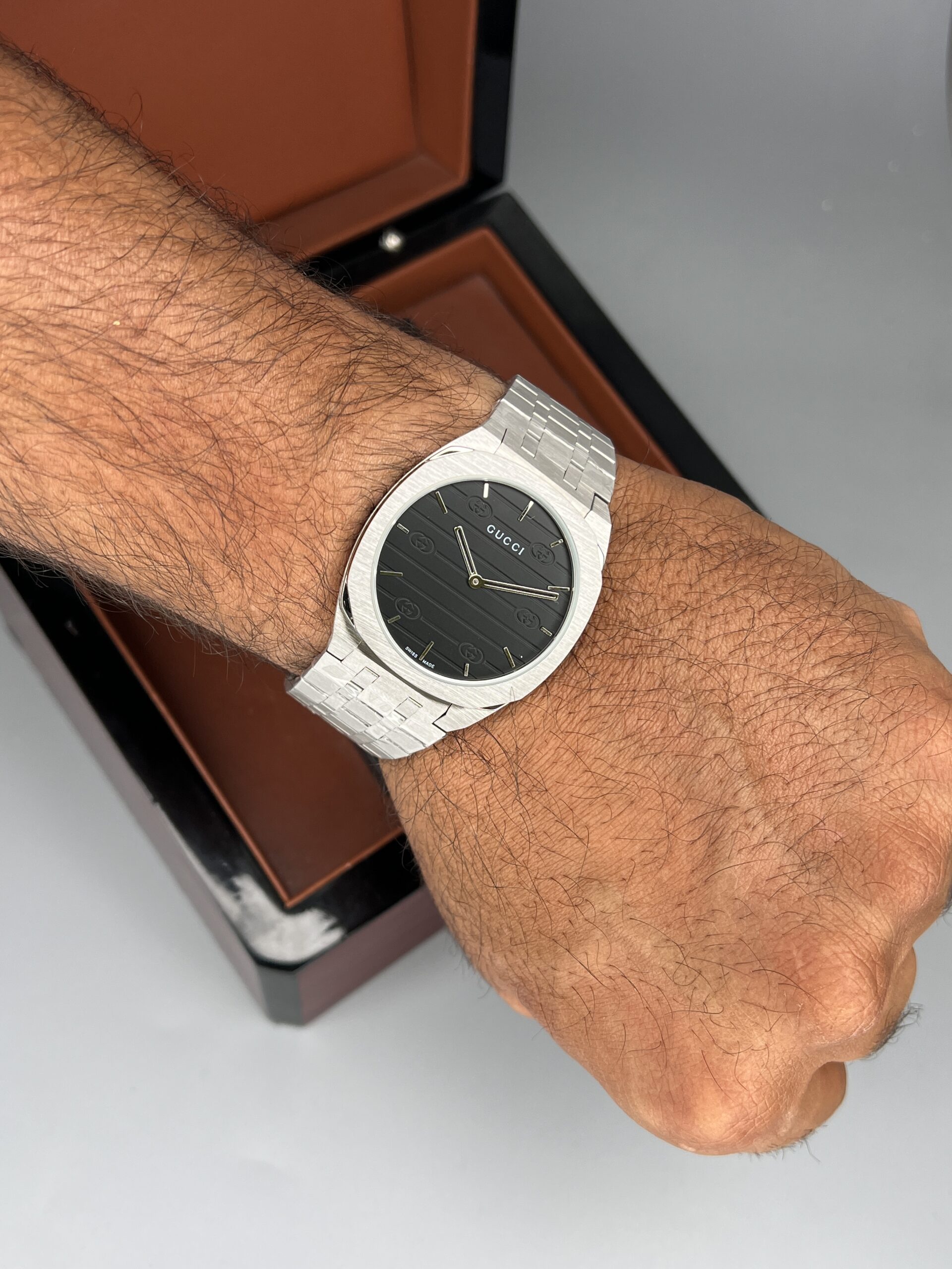این ساعت برای استایلهای اسپرت و فعالیتهای روزمره نیز مناسب است. طراحی مقاوم بند استیل و صفحه مشکی آن، این ساعت را به یک انتخاب ایدهآل برای فعالیتهای اسپرت تبدیل میکند. ساعت گوچی V2005 بهراحتی میتواند با لباسهای اسپرت شما ترکیب شود و به شما ظاهری شیک و جذاب بدهد.