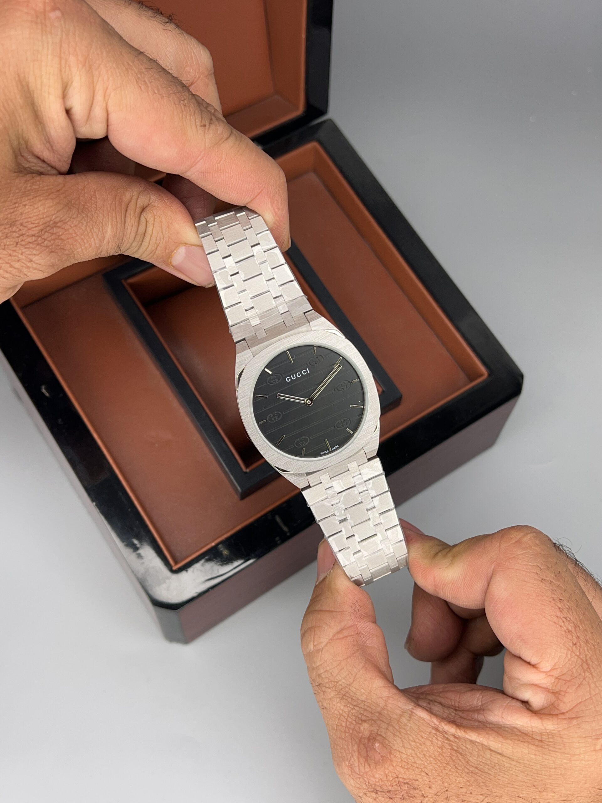 ساعت گوچی V2005 با صفحه مشکی و طراحی مینیمالیستی خود، ظاهری بسیار شیک و کلاسیک دارد. این طراحی ساده باعث میشود که ساعت نهتنها از نظر زیبایی جذاب باشد، بلکه از لحاظ عملکرد نیز عالی باشد. صفحه مشکی ساعت با عقربههای ساده و اندکسهای واضح، برای خواندن زمان در هر شرایط نوری مناسب است. این صفحه با تمامی جزئیات دقیق و بهینهشده، یک ساعت بسیار کاربردی و در عین حال زیبا را ارائه میدهد.